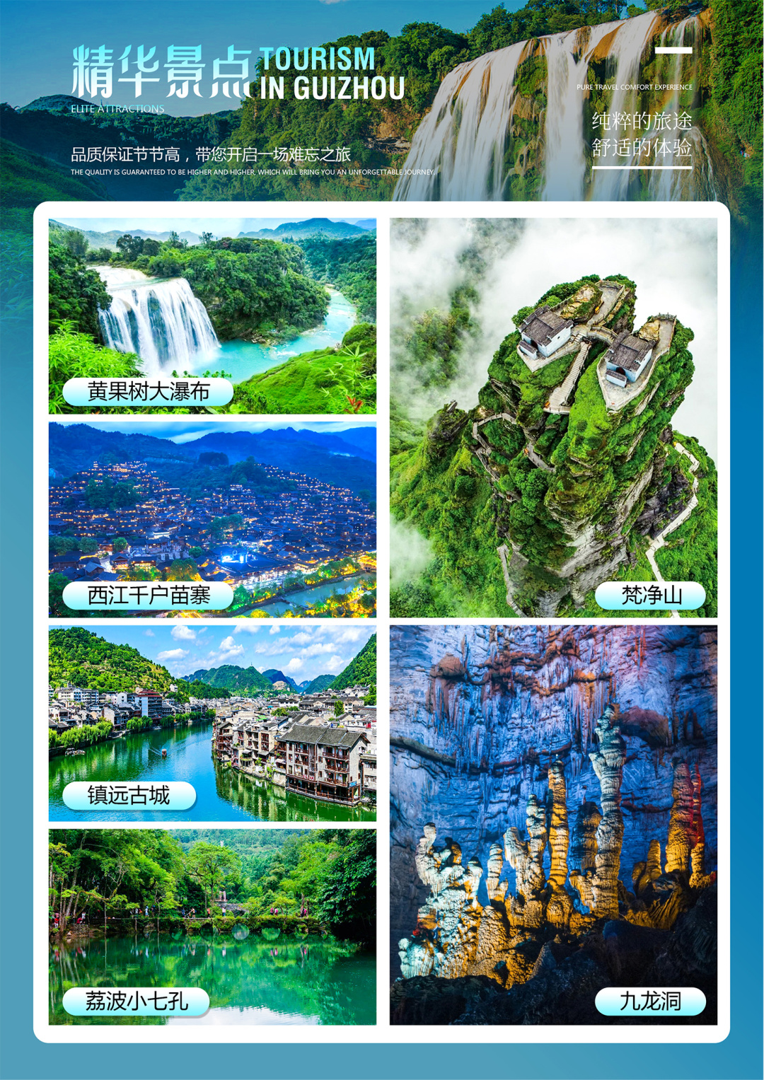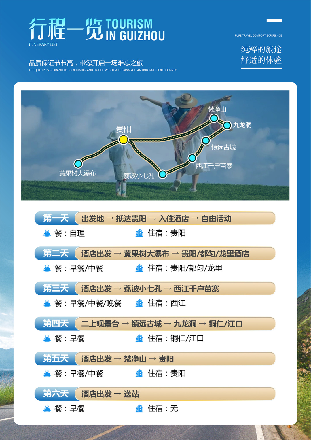 6、贵州地处云贵高原地区,山路较多,请穿轻便、柔软休闲鞋子;贵州素有天无三日晴之说,天气多雨,请自备雨伞;少数民族寄居地,请遵循当地风俗。