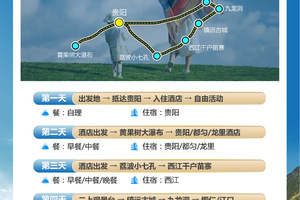 2、不含景区必消小交通:黄果树观光车50元/人+保险10元/人,小七孔观光车40元/人+保险10元/人,西江苗寨4程观光车20元/人+保险10元/人,镇远摆渡车20元/人,梵净山观光车48元/人+保险10元/人,梵净山东门往返索道140元/人,九龙洞往返观光车16元/人,费用需自理。总合计374元
