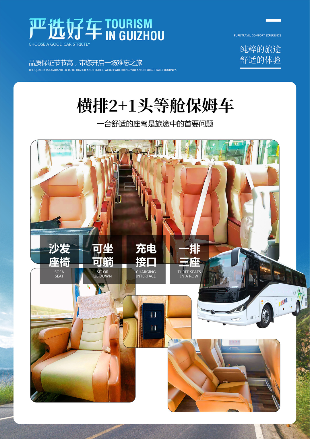 1、用车:广东往返贵阳动车高铁二等座+当地用车横排2+1头等舱保姆车(7人以内使用奔驰/别克商务车)