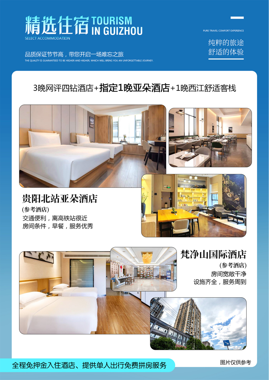 2、住宿:三晚网评四钻+一晚亚朵+一晚西江景区内舒适客栈,不提供三人间,如产生单人请自行另补单房差或者接受安排拼房。