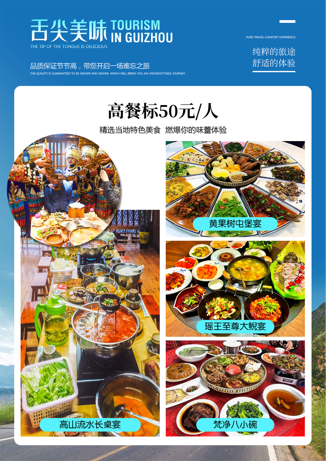 9、当地特色美食:【黄果树屯堡宴】+【荔波瑶王至尊大鲵宴】+【西江高山流水长桌宴】+【梵净八小碗】,高餐标50元/人。