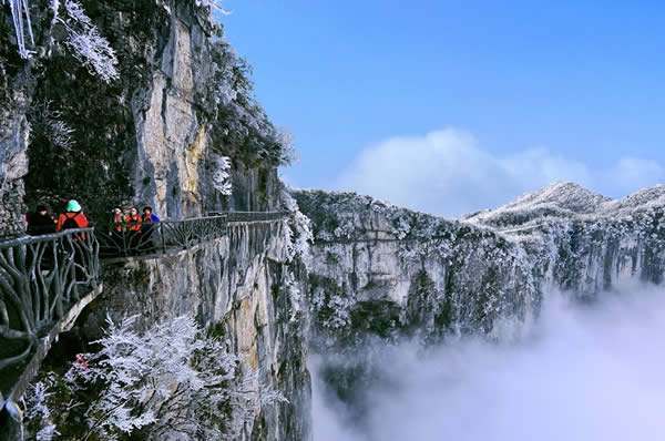 3、999级台阶顶至天门洞,可步行挑战。也可乘坐扶梯,共计12段(天门山扶梯64元/人未含),自由选择乘坐。上栈道的游客均要求戴上鞋套(鞋套费用5元/人未含),以保持玻璃桥的透明和干净
