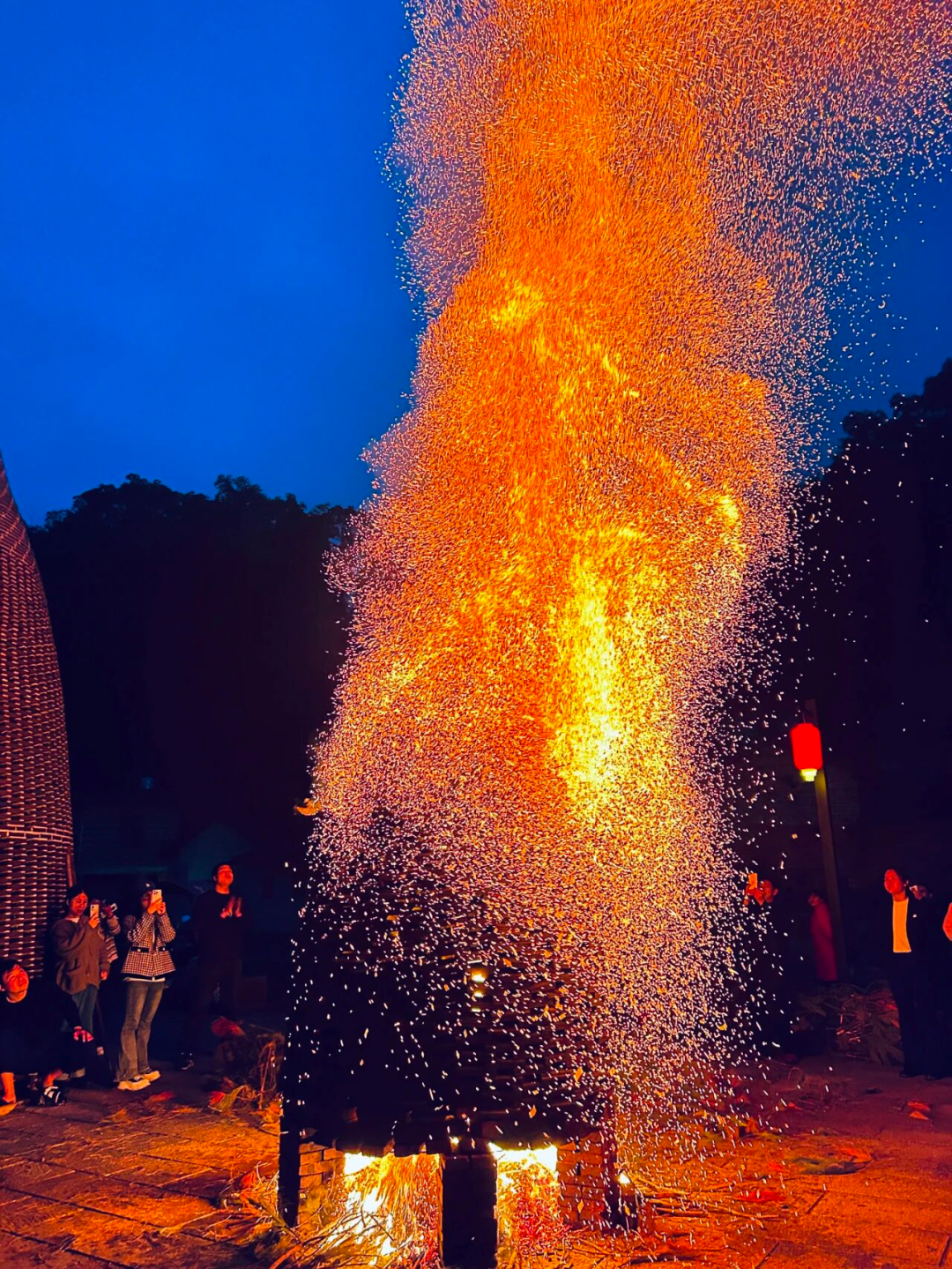月下烧瓦塔祈福:一场热烈的火焰仪式。点燃瓦塔,共祈好运,感受红火炽热的客家情怀。