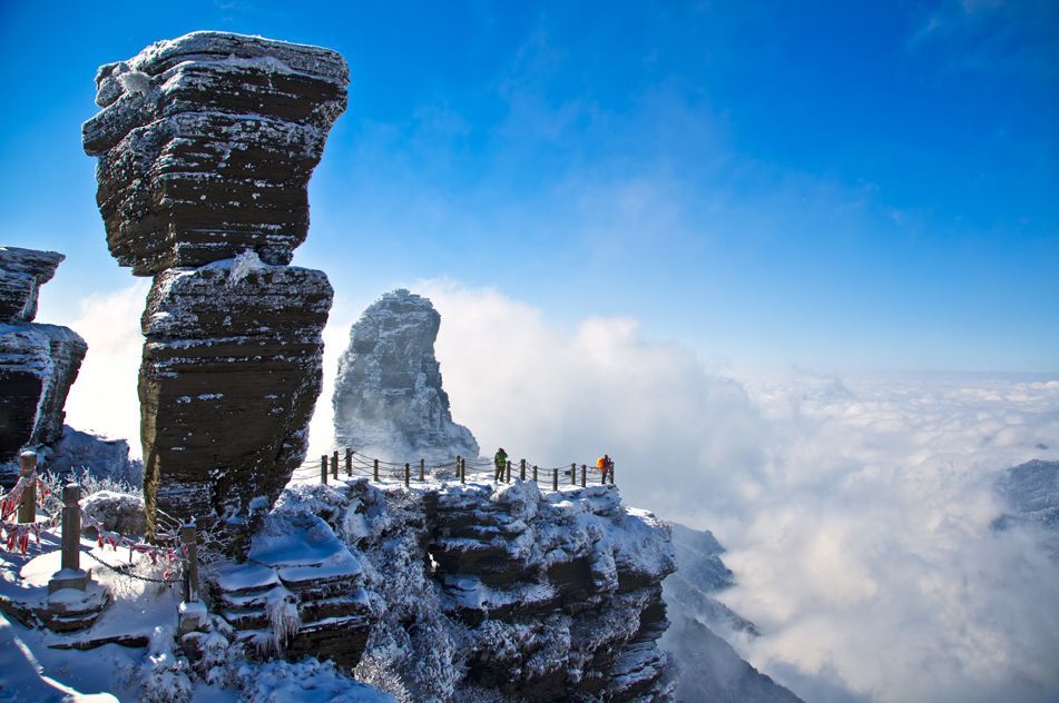 伴随穿破云雾的第一道阳光,梵净山云雾翻腾,视野逐渐通透,金色阳光洒满山间,“光雪雾”的交汇,梵净山美若仙境