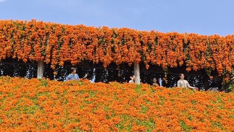 远远望去,上百米长数米高的三角梅