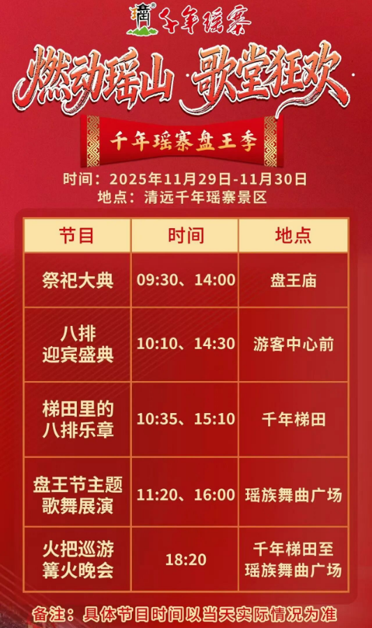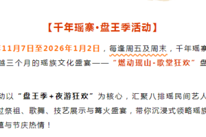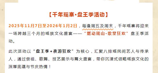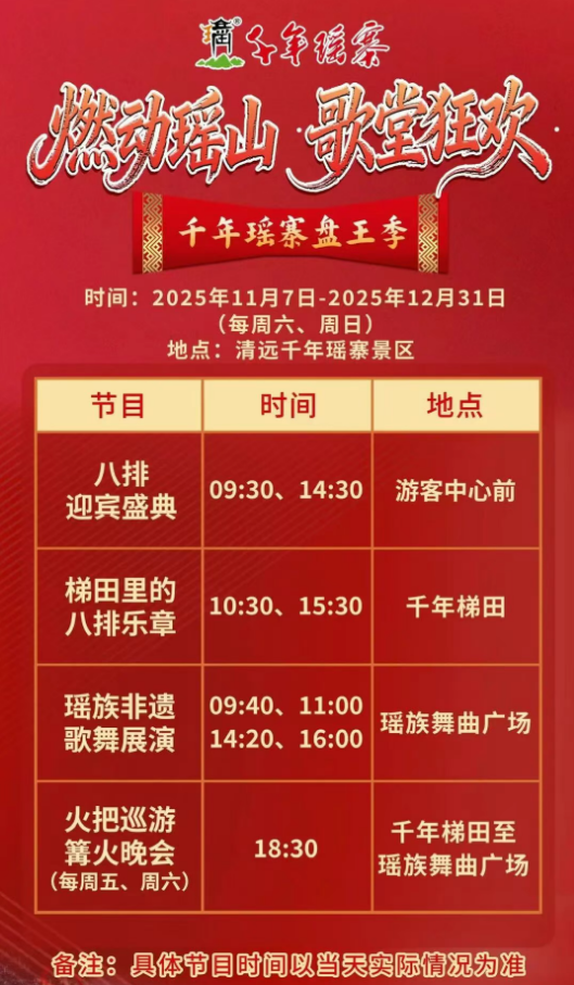 活动期间(2025年11月7日-2026年1月2日)的每个周五、周末及元旦假期,瑶寨都将安排精彩演出。(以景区实际为准)