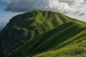 千丈岩:陡峭岩壁与草甸相接,呈现地质变迁的痕迹。