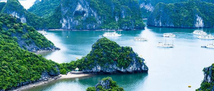 下龙湾位于越南广宁省,是一处闻名遐迩的旅游胜地。这里山海风光旖旎,景色如画。是典型的石灰岩喀斯特地貌海湾,被列入世界自然遗产名录。约 1600 多个大小岛屿错落有致地分布在海湾中,形态各异,有的像石柱,有的似拱门。海水清澈湛蓝,与翠绿的岛屿相互映衬。