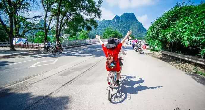 13:00挑选精美自行车游十里画廊,观遇龙河油风光,因沿路风景秀丽,如诗如画,被称为阳朔十里画廊,自行车骑行无疑是十里画廊的最佳游玩方式,对体力没有信心的游客可以选择升级电动车(需加30元),不需要人力踩,不担心出汗,在这个季节,是游览阳朔山水的最佳选择,途经工农桥、大榕树、月亮山等景点,可以随意拍照