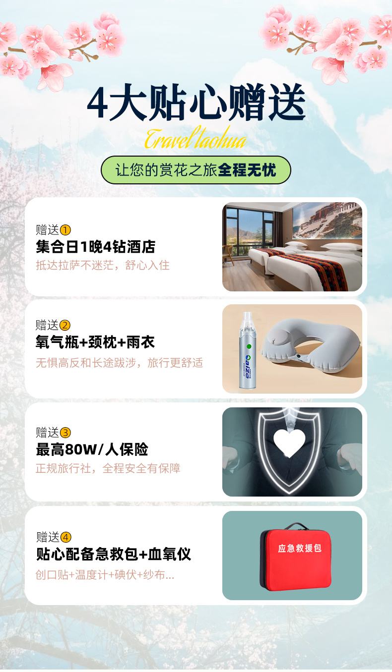 5、随团配备:急救包+血氧仪+温度计,随时观察了解客人的身体状况。