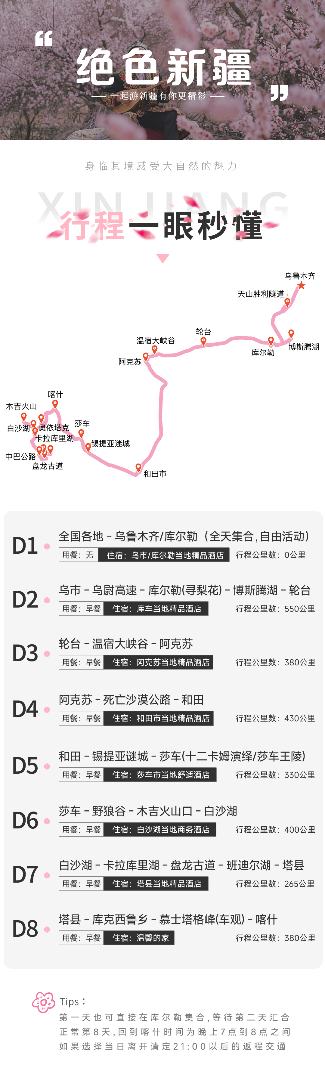6.由于新疆和内地有2小时时差,领队会在集合当天21:00之前通知第二天的集合时间及车牌号,请保持手机畅通。