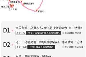 备注:今日也可以直接在库尔勒集合,上午自由活动,下午与大部队汇合。集合日乌鲁木齐的住宿可以更改为库尔勒。