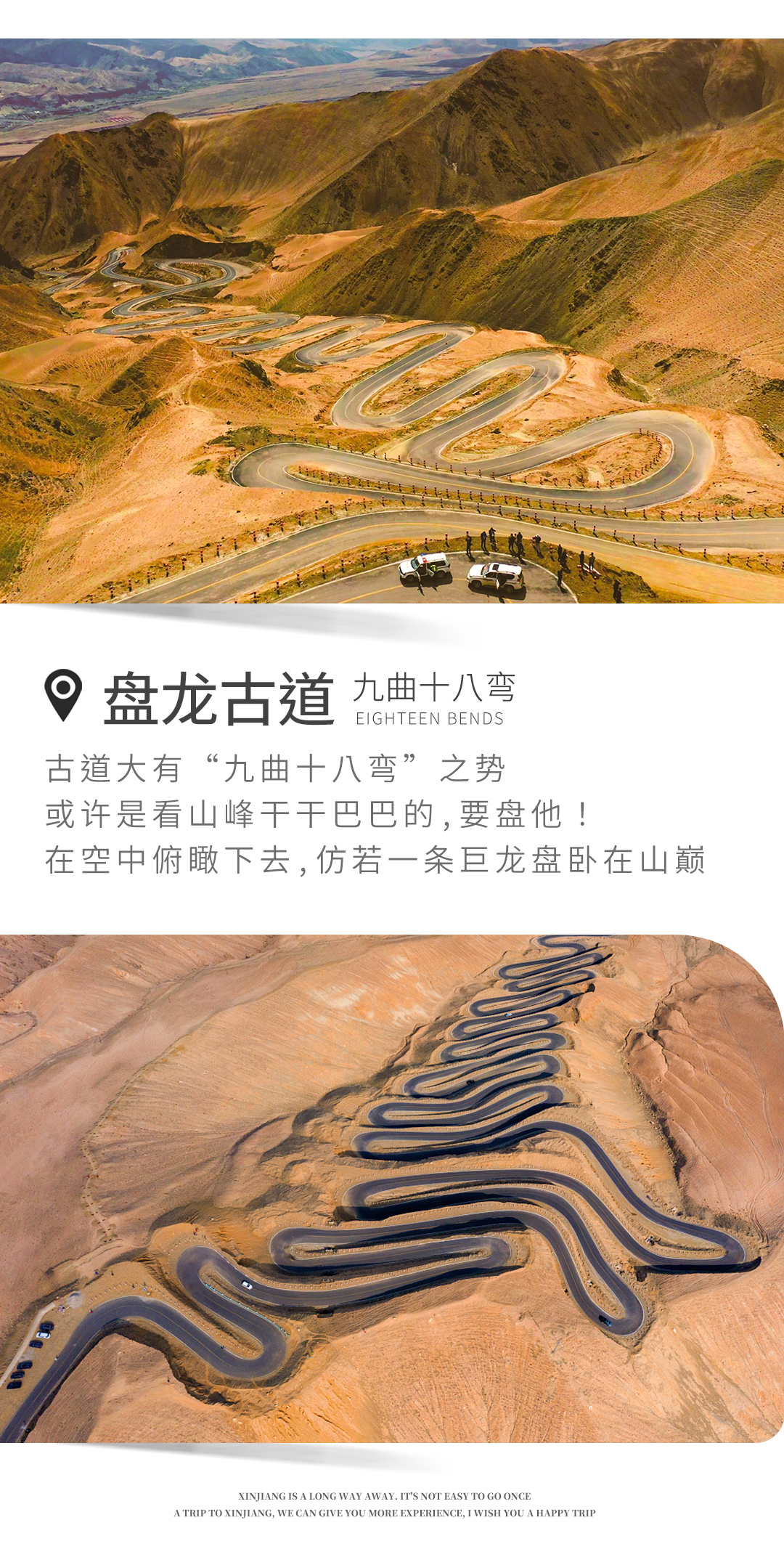 一路走一路游玩,沿途还会经过【塔合曼湿地】、【雪柳树洞】。最后抵达【盘龙古道】,盘龙古道全长36公里,最高海拔4,200米,落差达1,000米,公路从山顶到山脚共有600道S弯。 这600多道弯完美演绎了魔幻、神奇、壮丽与刺激。盘龙古道分为大盘龙和小盘龙。大盘龙弯度很大,但弯道不密集,沿途有许多观景台可供游人观赏风景;小盘龙道路蜿蜒而下,极具挑战性,无论是视觉体验,还是驾驶体验,都会让人心潮澎湃,肾上腺素激增。