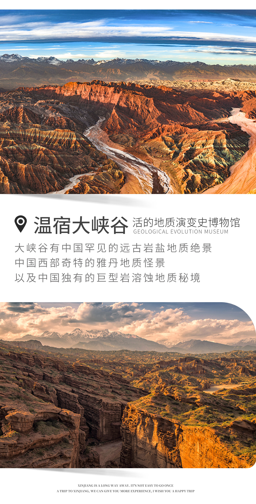 早餐后约9点出发前往&温宿大峡谷,是中国西部最美的丹霞地质奇景、中国最大的岩盐喀斯特地质胜景。位于温宿县境内天山山脉中段南麓前山区博孜敦柯尔克孜民族乡境内,这里曾是通往南北天山古代驿路木扎特古道的必经之地,进入景区,犹如进入了一片精美雄浑的自然画廊。峡谷中山壁岩层分布清晰,受挤压形成的褶皱,弯曲的线条十分清晰,断裂的岩石夹在山壁岩层中,在历经亿万年的风雨侵蚀后,形成了绝壁高耸、奇峰兀立、形态各异、嶙峋怪异、色彩浓烈、千姿百态、五彩纷呈的奇特景观,晚入住阿克苏酒店。