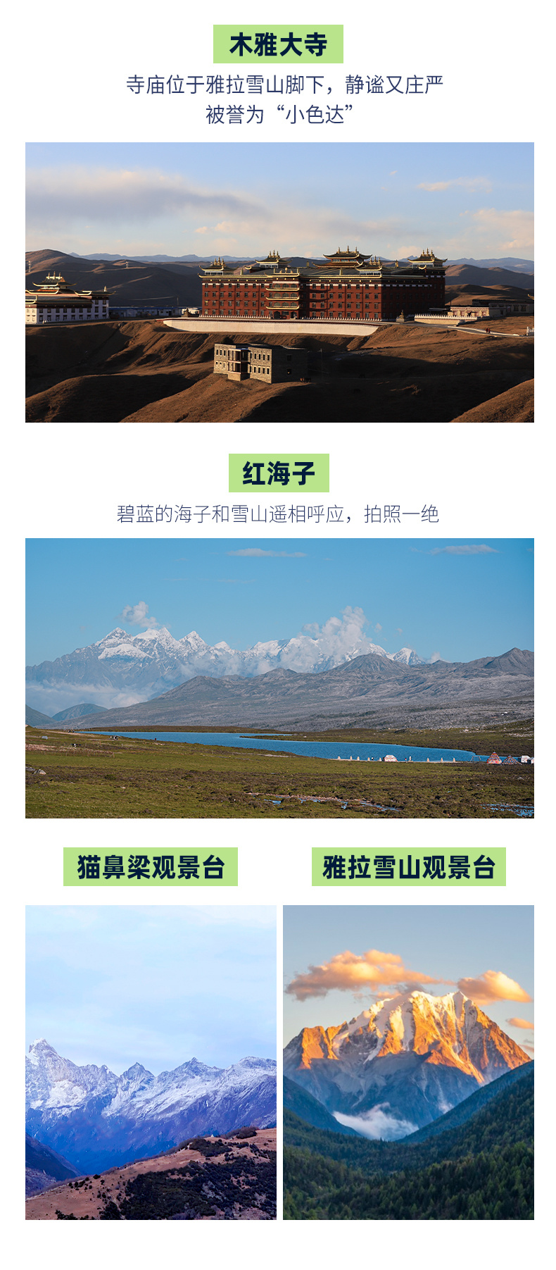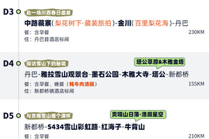 4、景交:四姑娘山双桥沟观光车70元/人(必须);墨石公园观光车20元/人(必须);红海子清洁费30元/人(可选);木雅大寺门票16元/人(可选);泸定桥上桥保险5元/人(可选);牛背山卡丁车单程140元/车/双人(可选),目前牛背山免观光车(如后续开始收费请自理);