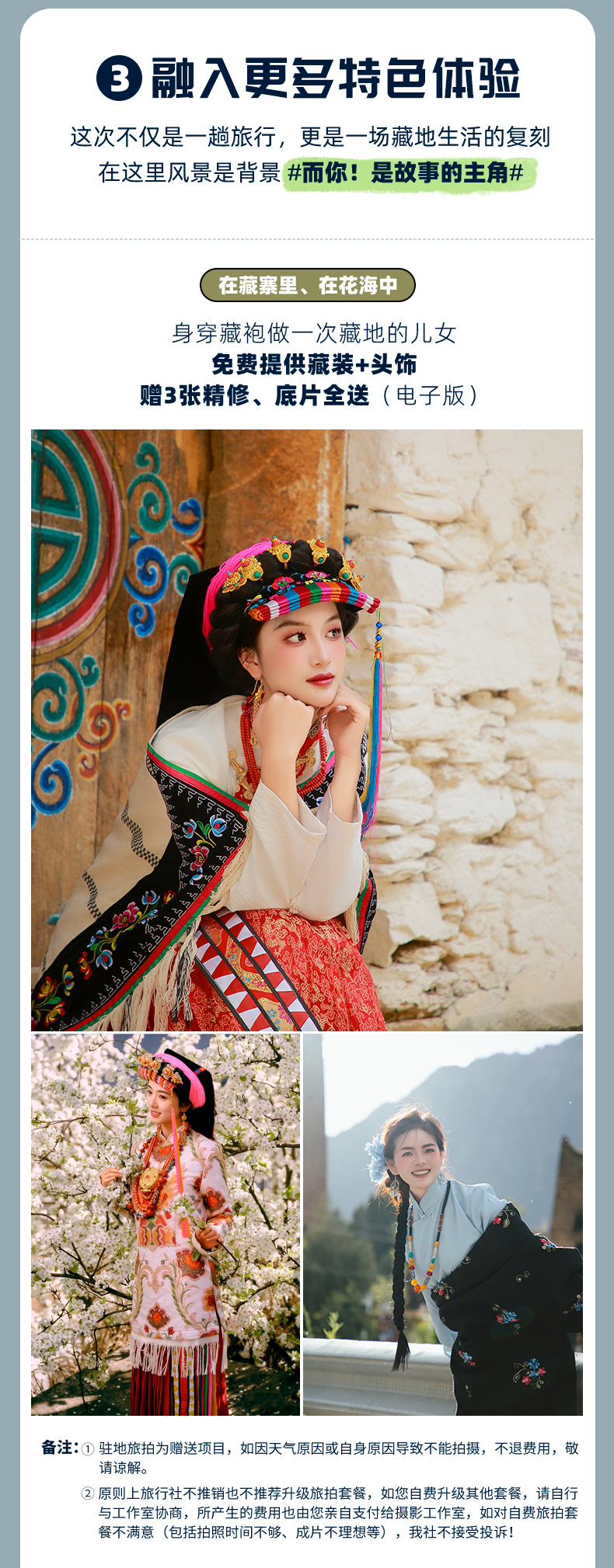 2、驻地藏式旅拍1次(免费提供藏装、头饰,赠3张电子版简修,底片全送);