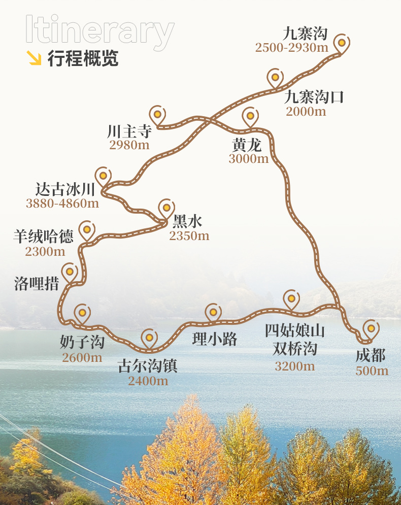 门票 | 四姑娘山双桥沟门票80元、达古冰川门票80元、九寨沟门票190元、黄龙景区门票170元 注:如持有老年证、军官证、士兵证、退役军人优待证、伤残证、学生证、国家级记者证等特殊证件,或杭州市、温州市、绍兴市、湖州市、嘉兴市、金华市、台州市7市户籍市民。请在购票前向工作人员出示相关证件,根据当地政策减免相关费用,如有优惠,现场退还相应差价。所有出团的队伍,需要提前网上购票,请在报名时,告知客服,自己有可以减免门票的有效证件,以便于客服购买网购票。 |