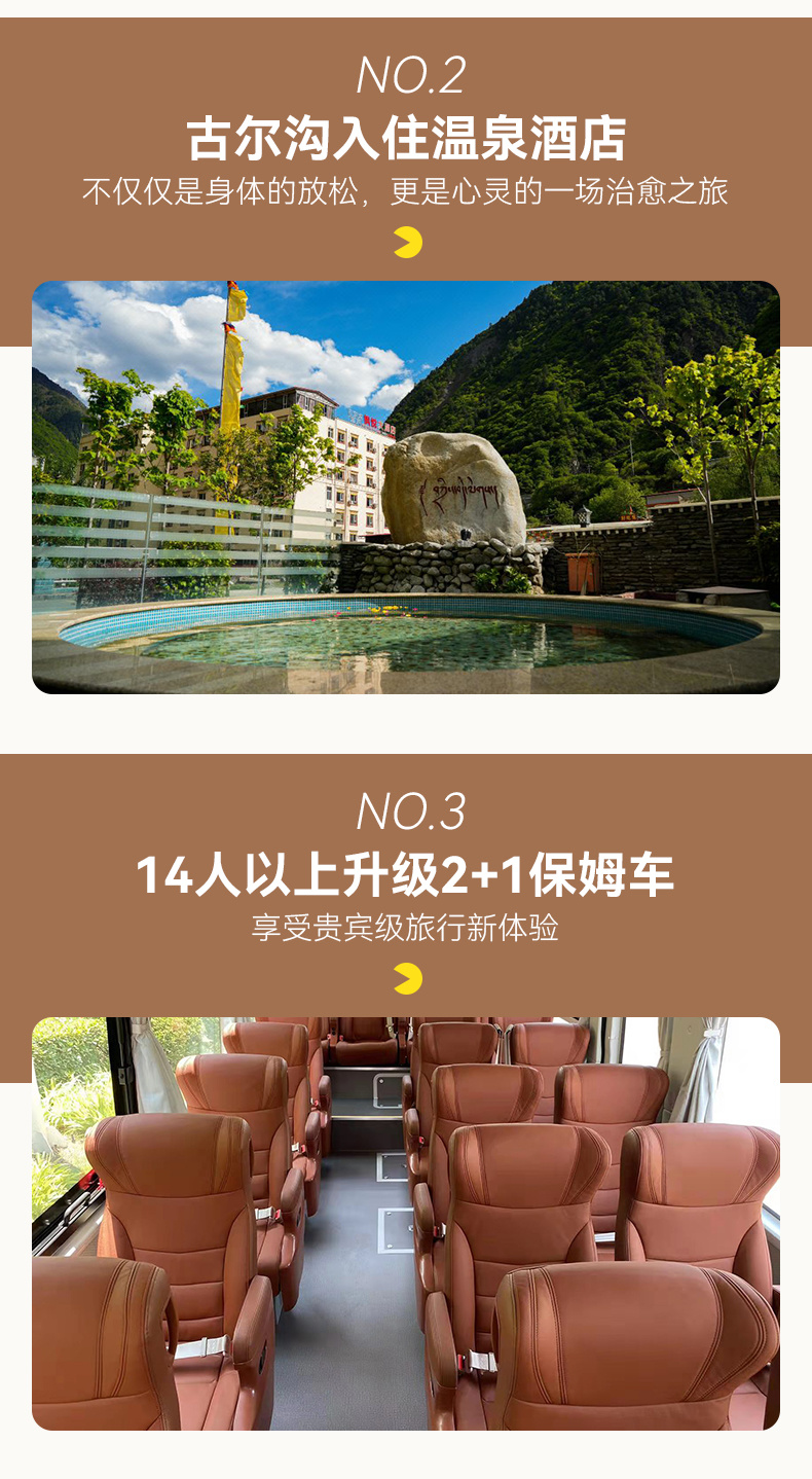 住宿 | 按行程所列标准入住: ①1晚古尔沟温泉酒店②1晚黑水县酒店③1晚九寨沟口酒店④1晚川主寺镇酒店 |
