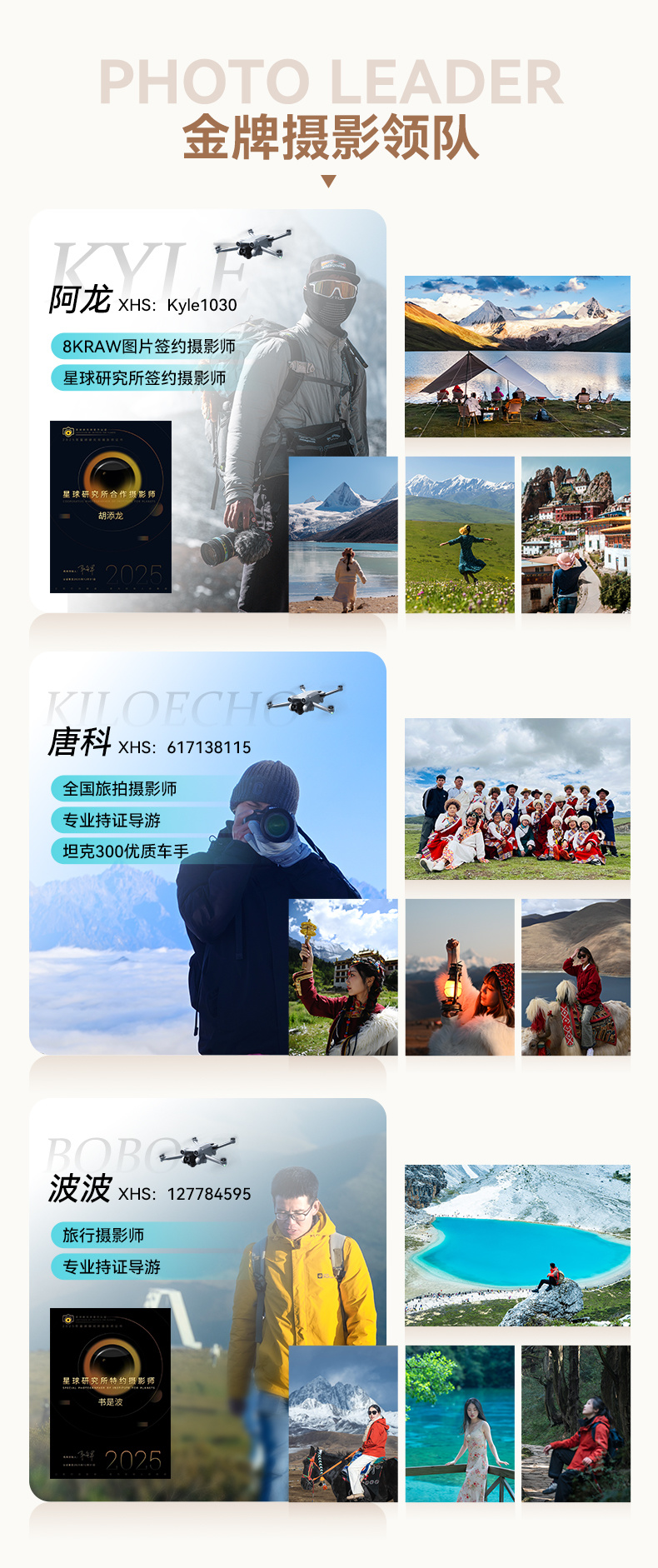 2025年【活动批次】,每周二/周六固定发团 第01期:09月13日(集合日)-09月18日(散团日) 第02期:09月16日(集合日)-09月21日(散团日) 第03期:09月20日(集合日)-09月25日(散团日) 第04期:09月23日(集合日)-9月28日(散团日) 24人常规团:3680元/人,儿童价2240元,单房差880元 第05期:09月27日(集合日)-10月02日(散团日)跨国庆 第06期:10月01日(集合日)-10月06日(散团日)国庆节(升级摄影领队) 第07期:10月02日(集合日)-10月07日(散团日)国庆节 第08期:10月03日(集合日)-10月08日(散团日)国庆节 24人常规团:4080元/人,儿童价2640元,单房差1280元 第09期:10月11日(集合日)-10月16日(散团日) 第10期:10月14日(集合日)-10月19日(散团日)(升级摄影领队) 第11期:10月18日(集合日)-10月23日(散团日) 第12期:10月21日(集合日)-10月26日(散团日) 第13期:10月25日(集合日)-10月30日(散团日)(升级摄影领队) 第14期:10月28日(集合日)-11月02日(散团日) 24人常规团:3680元/人,儿童价2240元,单房差880元 第15期:11月01日(集合日)-11月06日(散团日) 第16期:11月04日(集合日)-11月09日(散团日)(升级摄影领队) 第17期:11月08日(集合日)-11月13日(散团日) 第18期:11月11日(集合日)-11月16日(散团日) 第19期:11月15日(集合日)-11月20日(散团日)(升级摄影领队) 第20期:11月18日(集合日)-11月23日(散团日) 第21期:11月22日(集合日)-11月27日(散团日) 24人常规团:3580元/人,儿童价2140元,单房差780元 |