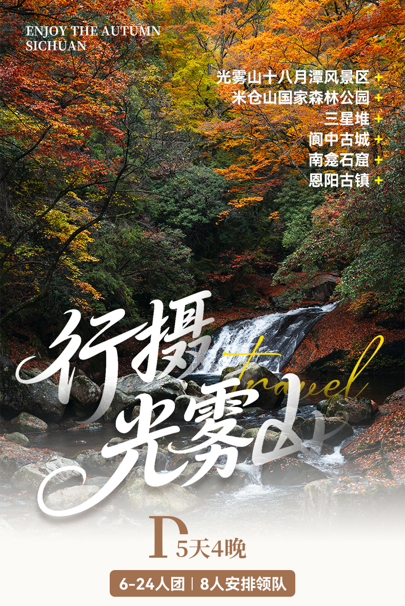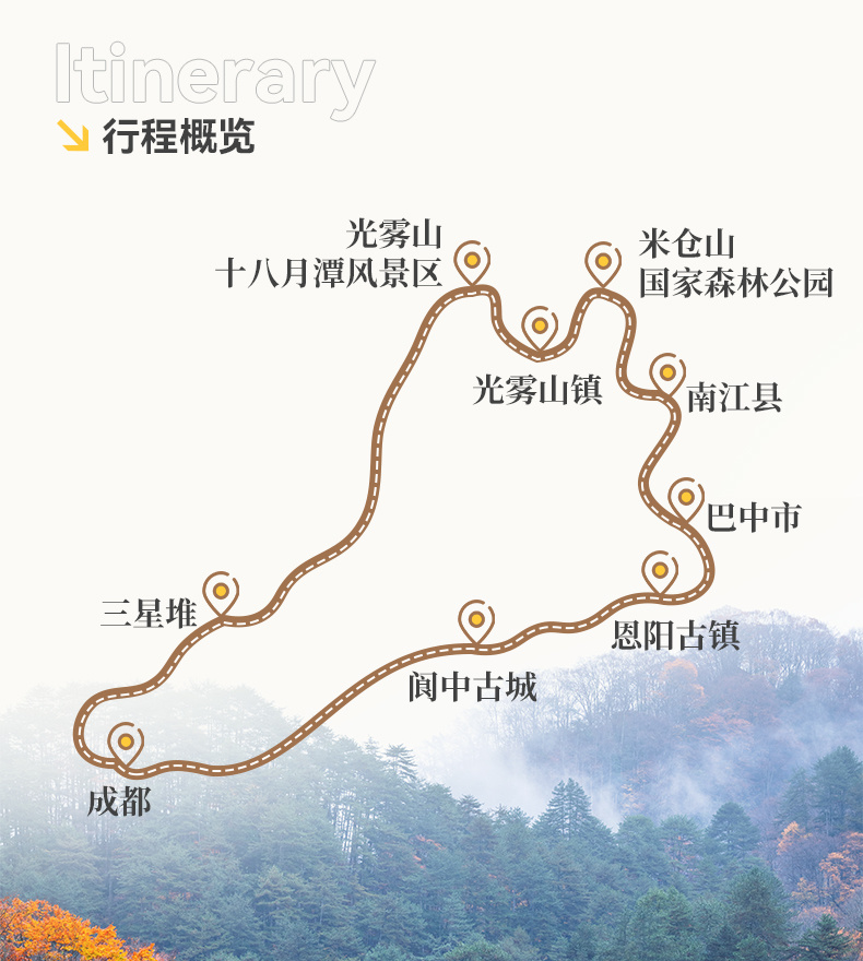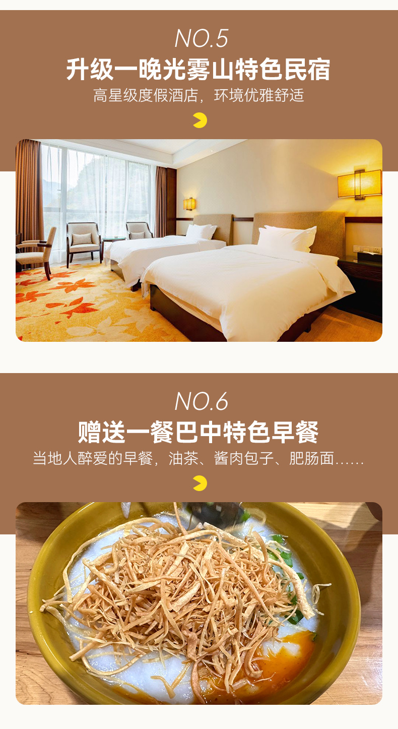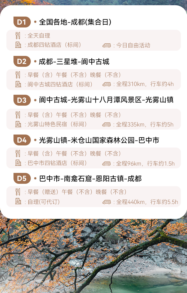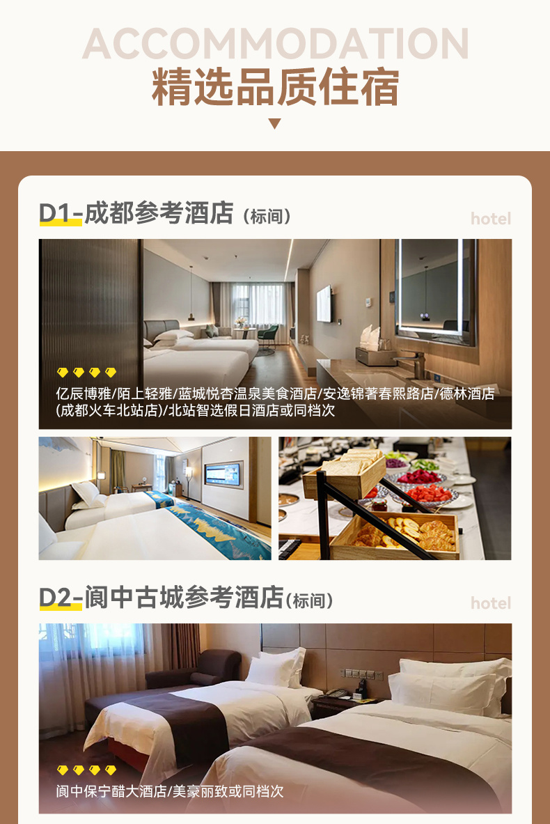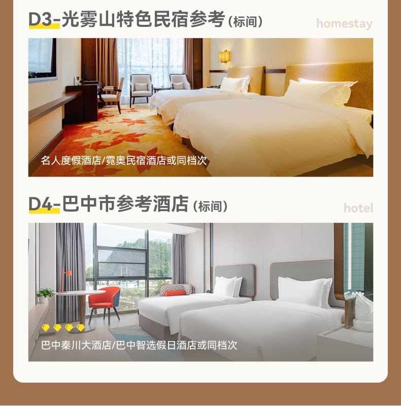 住宿 | 按行程所列标准入住: ①1晚阆中古城四钻酒店②1晚光雾山特色民宿③1晚巴中市四钻酒店 |