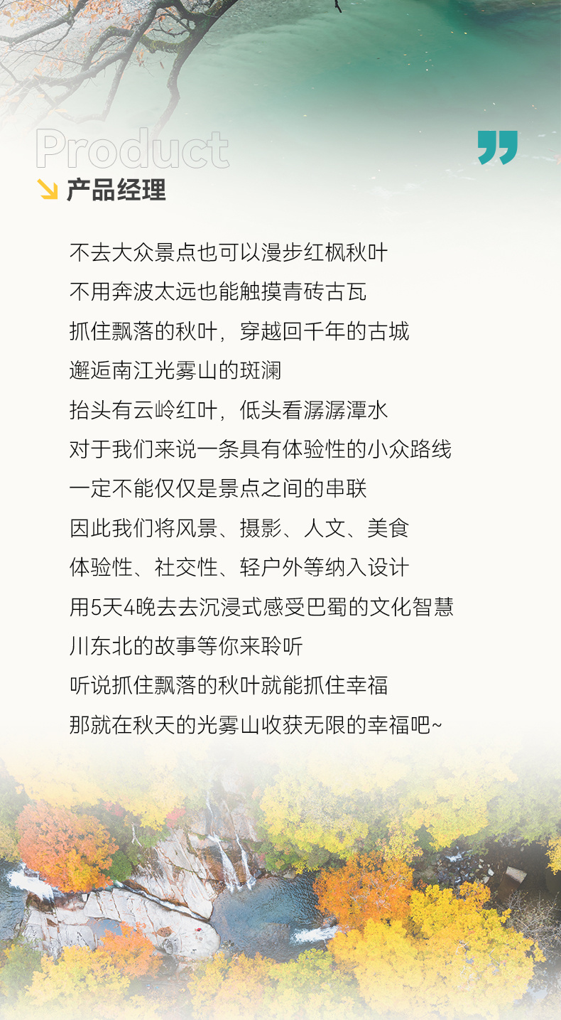 门票 | 景区其他个人消费自理,以下仅供参考: ①光雾山米仓山观光车60元/人(必选) ②十八月潭观光车10元/人(必选) ③香炉山索道单程80元/人,往返150元/人(可选) |