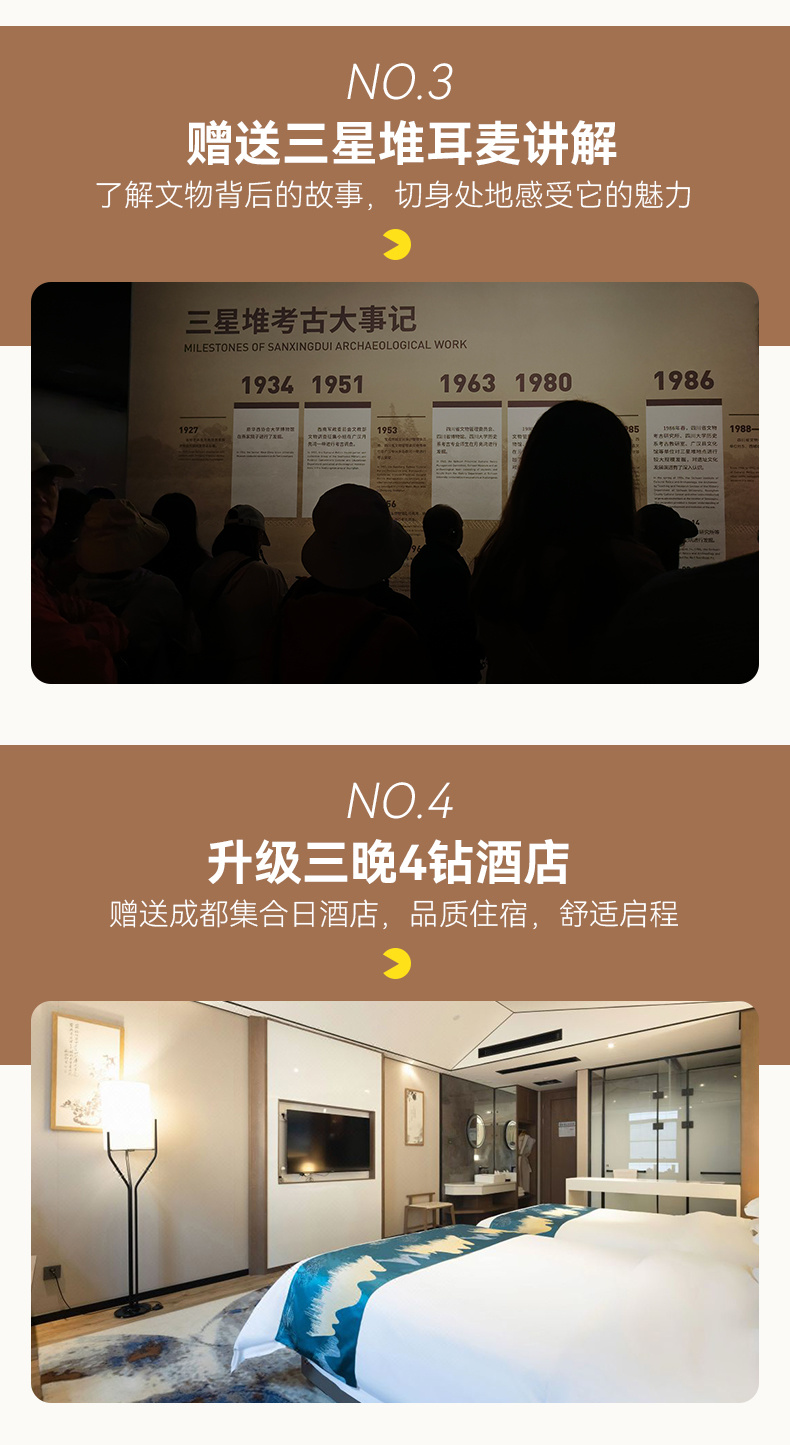 门票 | 三星堆门票及耳麦讲解87元、十八月潭门票55元,米仓山国家森林公园门票90元, 南龛石窟门票40元 注:如持有老年证、军官证、士兵证、退役军人优待证、伤残证、学生证、国家级记者证等特殊证件,或杭州市、温州市、绍兴市、湖州市、嘉兴市、金华市、台州市7市户籍市民。请在购票前向工作人员出示相关证件,根据当地政策减免相关费用,如有优惠,现场退还相应差价。所有出团的队伍,需要提前网上购票,请在报名时,告知客服,自己有可以减免门票的有效证件,以便于客服购买网购票。 |
