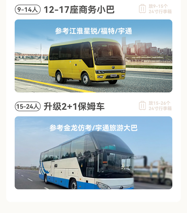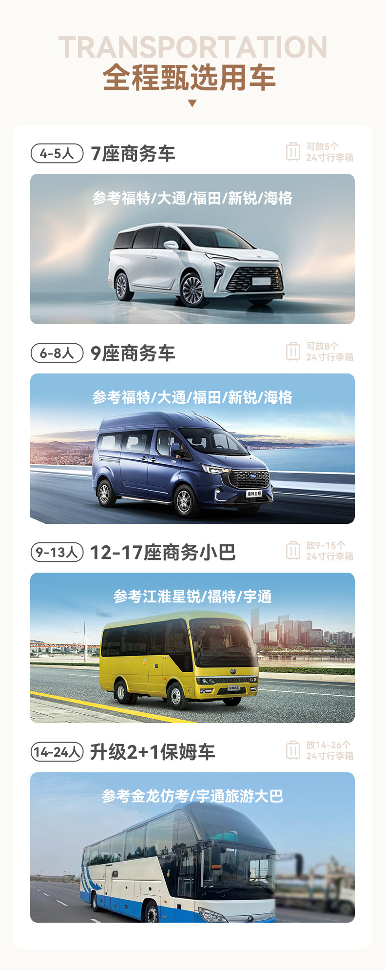 交通 | 全程包车往返,根据人数选择合适车型 |