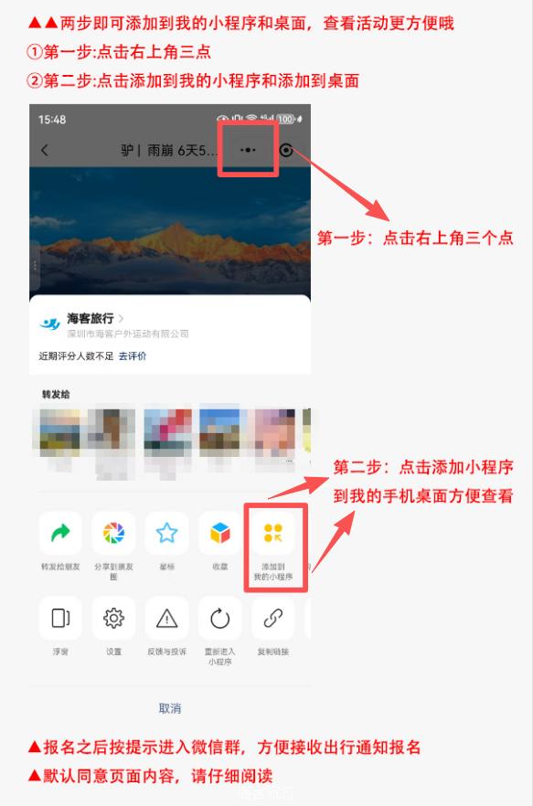 转发 → 截图 → 报名上传 → 支付 → 等待出行当天(最多延迟1-2天)原路返现到账