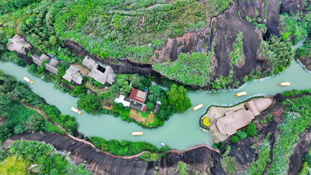 九龙水寨环抱在碧波荡漾的翠江怀里,天生丽质,美得不可方物,两岸丹霞、峭壁森然而立,直指云霄,厚重而伟岸。这就使得九龙水寨刚柔并济,既有二八佳人的温婉曼妙,又有关东大汉的豪迈沉雄。