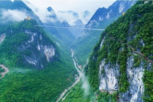 登【云天渡玻璃桥】天云渡玻璃桥长 588 米、高488米,为世界最长最高的玻璃吊桥,堪称世界奇迹!跨过天云渡到达缥缈峰,可挑战1999级悬崖绝壁栈道天梯及穿过灵鹫宫天然喀斯特溶洞。悬崖天梯盘旋在断魂崖绝壁之上,39道拐如飞龙般缠绕在山腰之间,颇有一夫当关、万夫莫开之势。灵鹫宫是缥缈峰的灵魂,坐落在缥缈峰断魂崖万丈绝壁之上。是一个天然喀斯特溶洞,每当气温骤降,洞口便会呈现吞云吐雾的神奇景象,当地人传说,那是神仙在洞里隐居修仙所吐出的真气